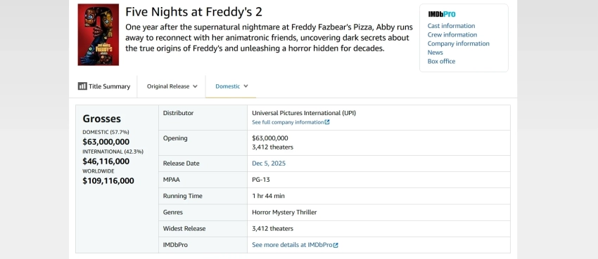 Хоррор «Пять ночей с Фредди 2» уже окупился, но на старте собрал меньше первого фильма