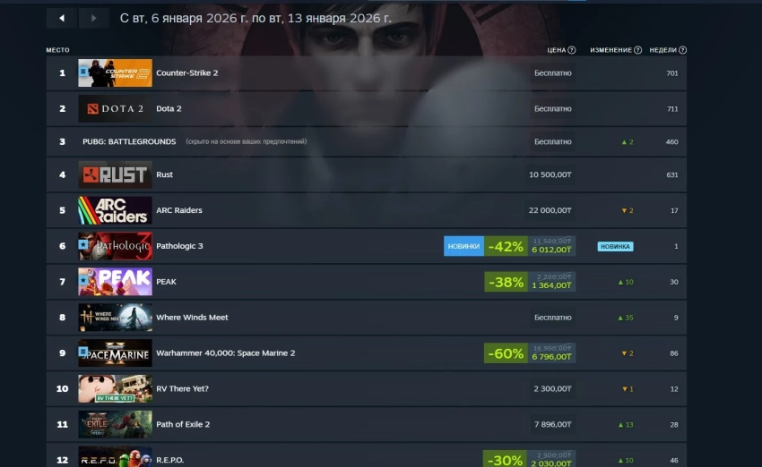 А российский сегмент Steam смог порадовать Pathologic 3. Третий «Мор» занял шестую строчку и уже получил очень положительные отзывы, в том числе от авторки Игромании — познакомиться с новинкой ближе можно в развёрнутой рецензии. А Warhammer 40,000: Space Marine 2, которая продаётся с крупной скидкой, уступила своё место Peak и заняла девятую строчку.