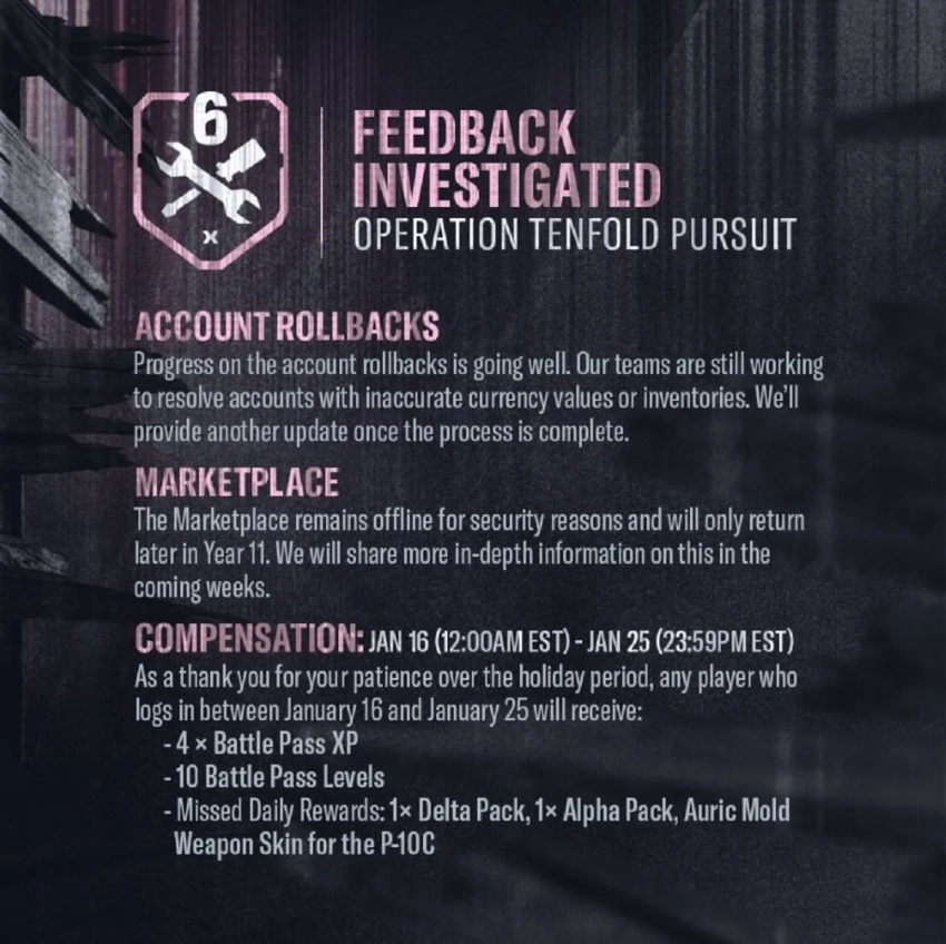 А вот ждать открытия торговой площадки пока не стоит — она отправлена в автономный режим, а запуск состоится только в рамках 11-го года поддержки Rainbow Six Siege X. Подробности расскажут в ближайшее время. Зато уже сейчас появились детали о компенсации, которую Ubisoft припасла игрокам за доставленные неудобства.
