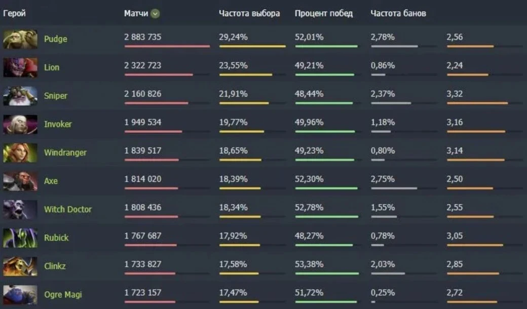 • Лидеры меты: Несмотря на спад, игроки остаются верны классике. Самым популярным героем периода стал Pudge, которого выбрали в 3 180 061 матчах.