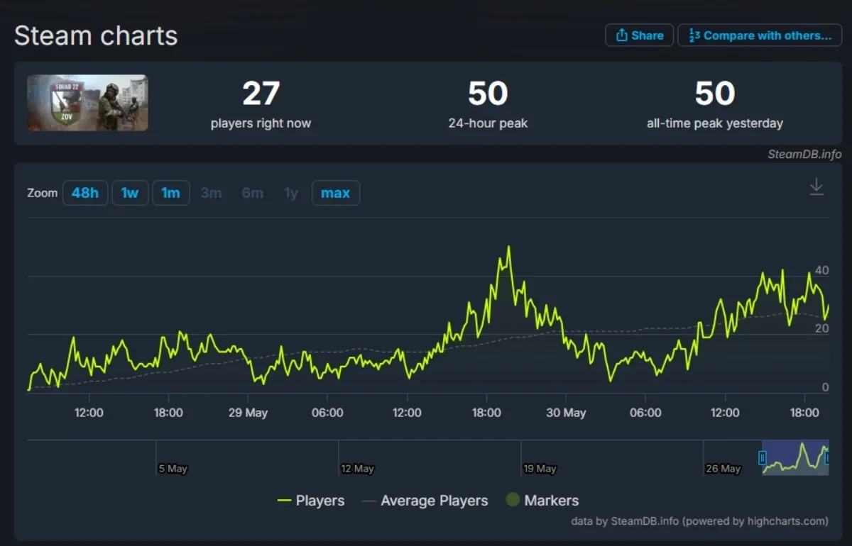 Изначально Squad 22 не была доступна в российском сегменте сервиса Valve. Но со временем появилась и здесь. По словам разработчиков, период модерации в Steam занял 1,5 месяца. Несмотря на многочисленные упоминания в медиа, онлайн тактики в пике составляет 50 игроков.